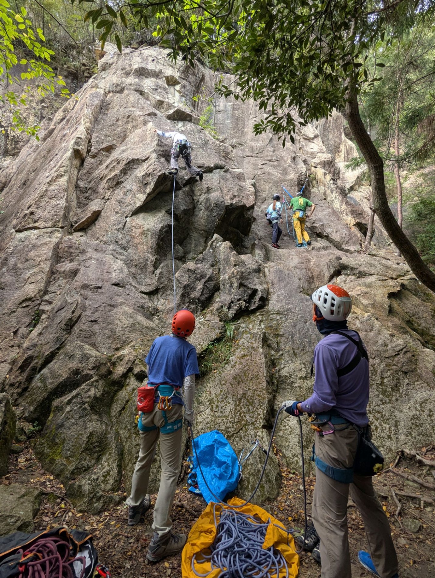 右はマルチ初のokさんに懸垂下降を教えるyukki、左はエイトマンverを登る師匠をビレイするseiさん。