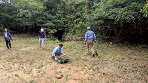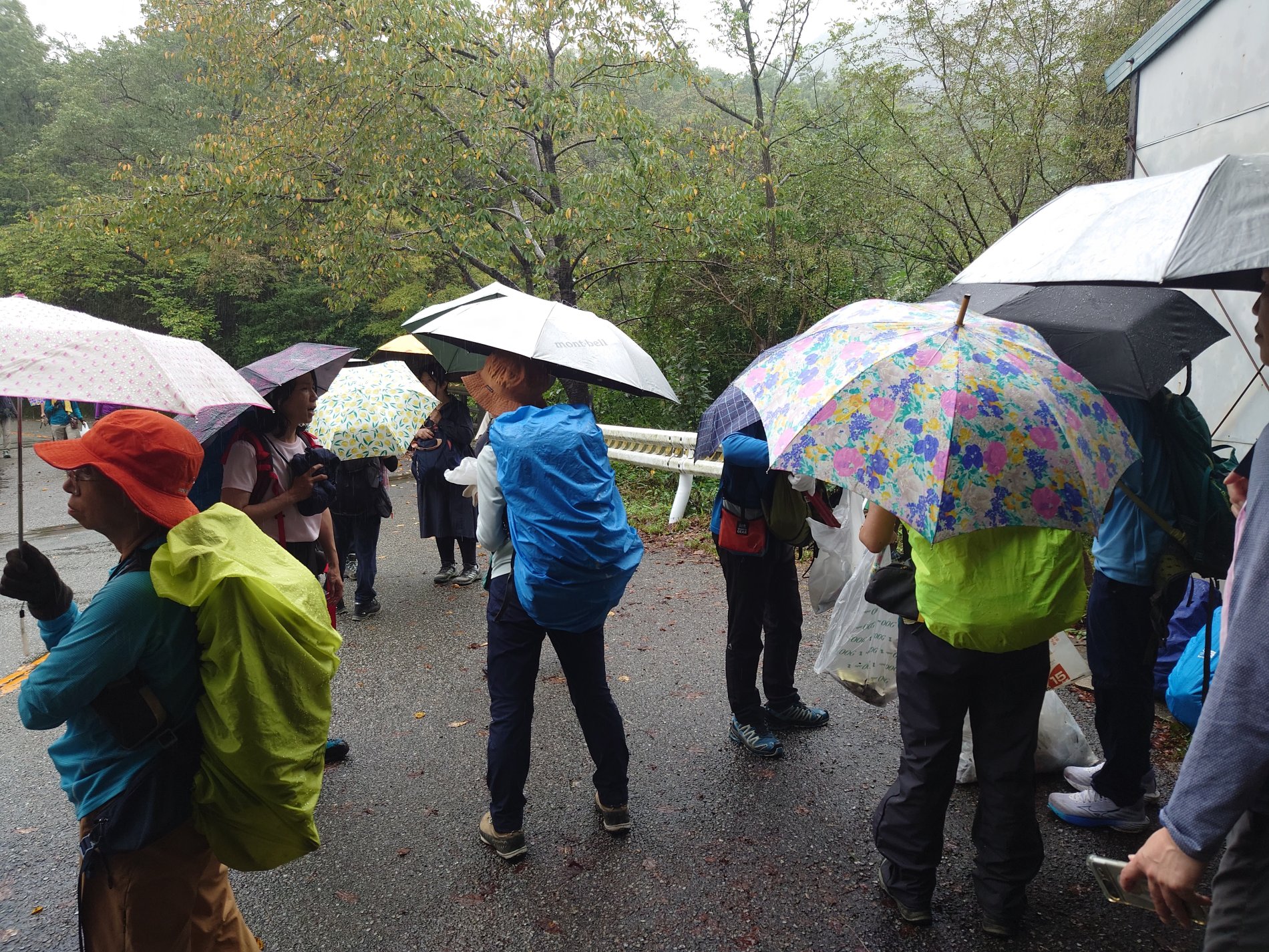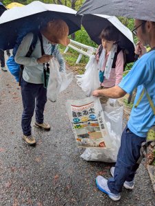 車道、公園内、工事現場の近く、ハイキングルートウロウロしたが、ほとんど道にはゴミは落ちてなく、道沿いから少し見えるゴミを取ろうとすると、奥の方に見えるゴミたち。その連鎖から、かなりゴミを回収できた。作業中バケツをひっくり返したような土砂降りで、皆すぐさま傘を開く。びっくりしたな〜