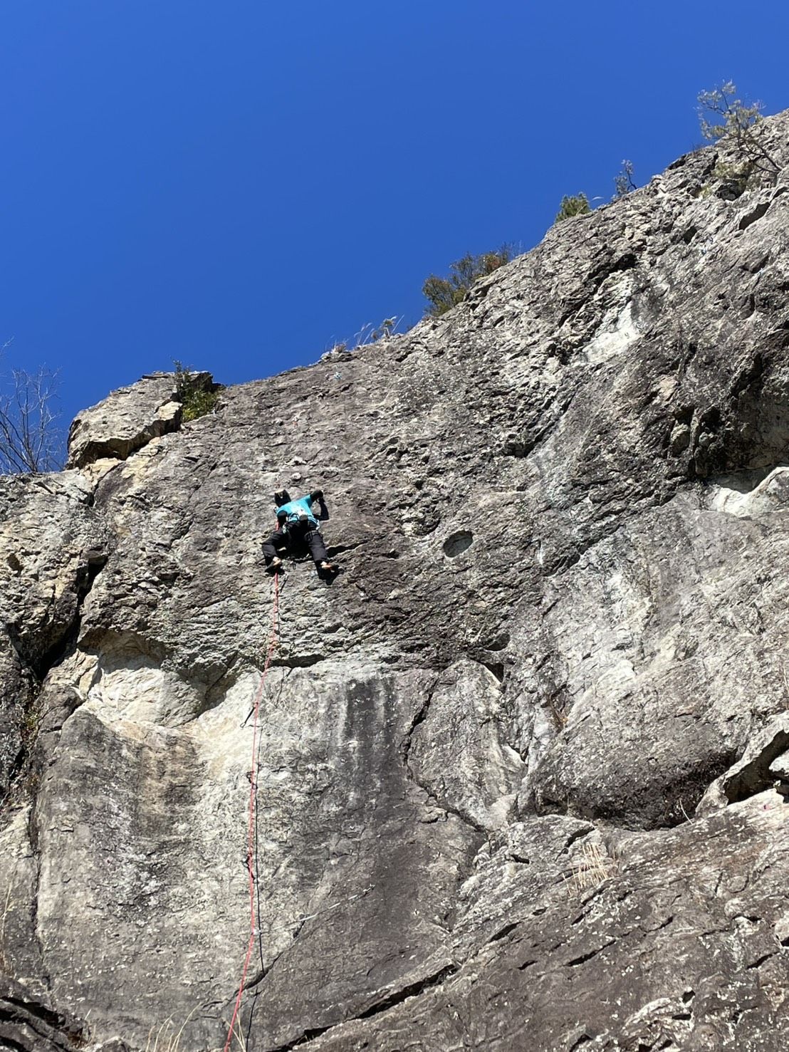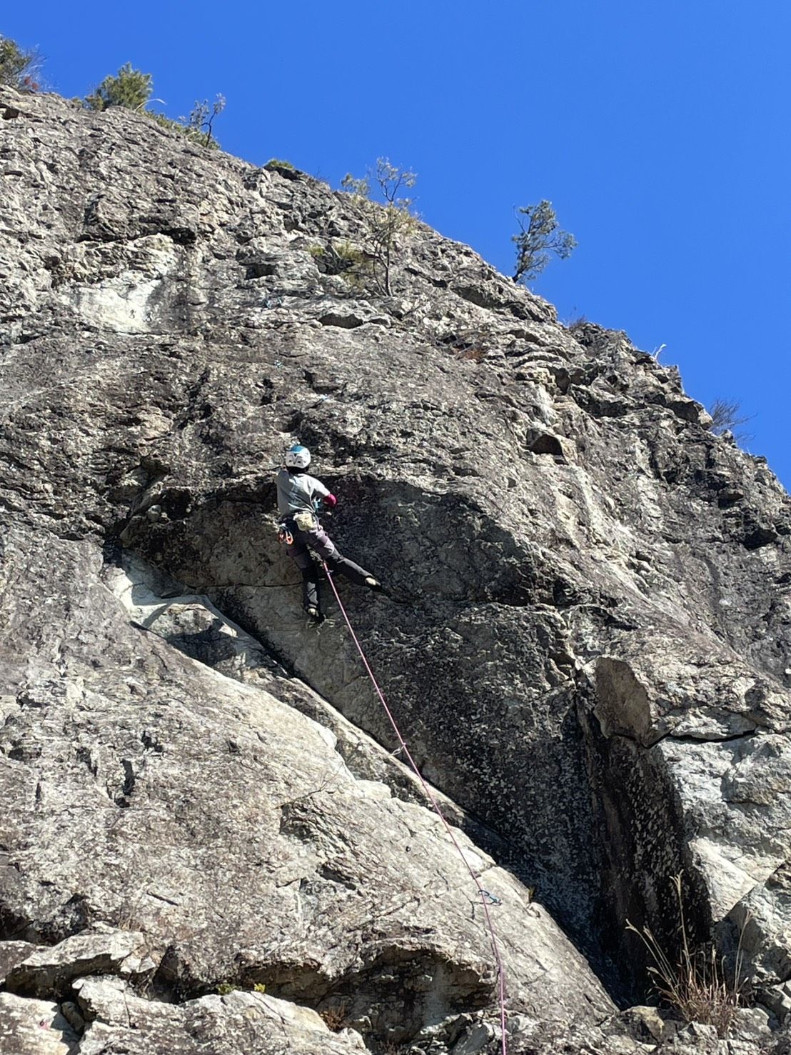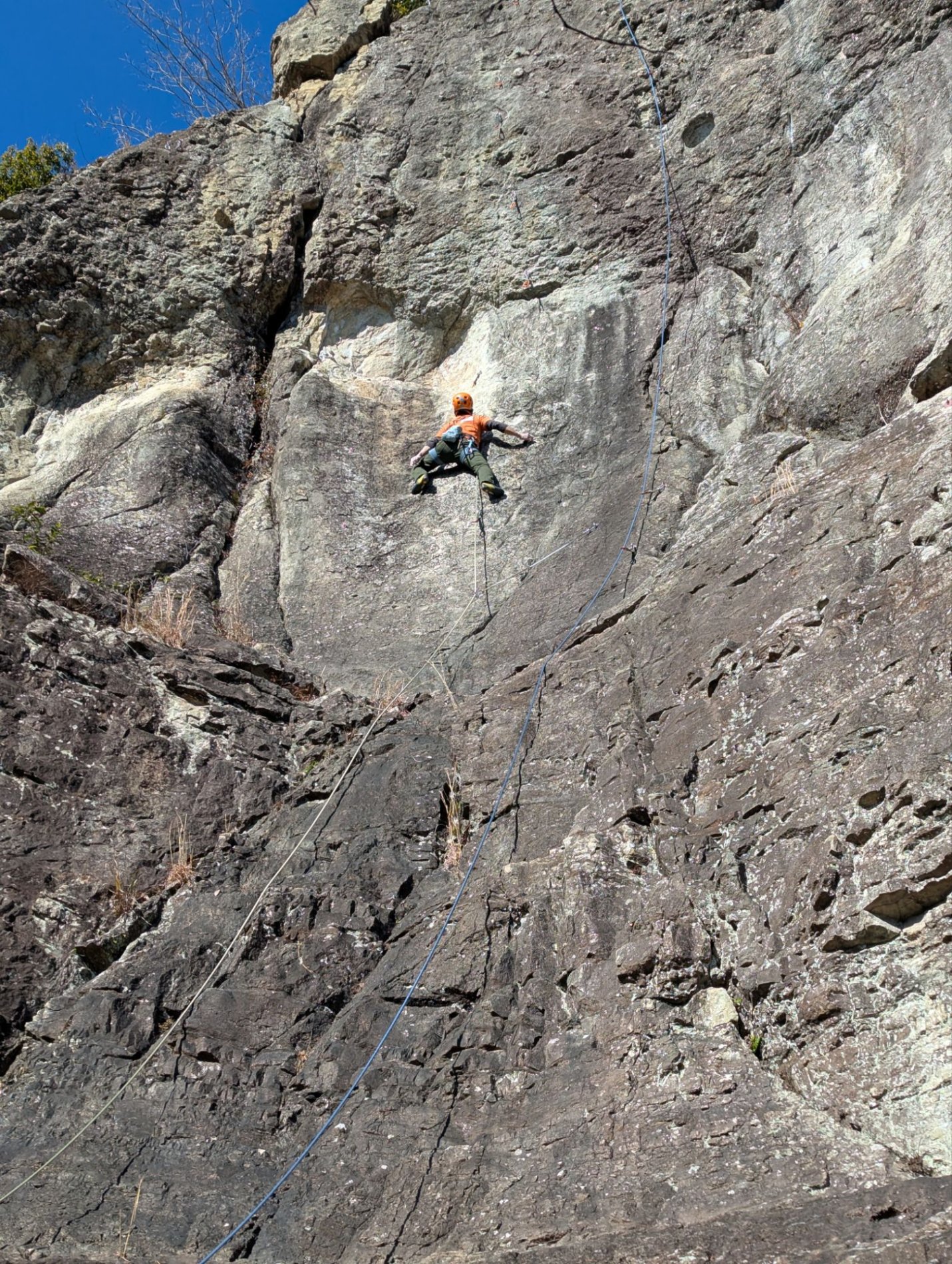 ワンマンショーの1ピン目は、見てる側もゾワゾワするくらい恐ろしい。komeちゃんはスラブが苦手とのこと。スラブのあとのアンダーを忘れてた何とかで徐々に修正しつつ、3便出して回収。次にhassyもワンマンショーに取り付きますが、こちらはスラブが得意なようで、サクサク登っていきます。ワンマンショーのスラブは「行けた」とホッとした瞬間に足が抜けたりするので、ビレイヤーは、マグロ釣りみたいに備えないといけませんね。
