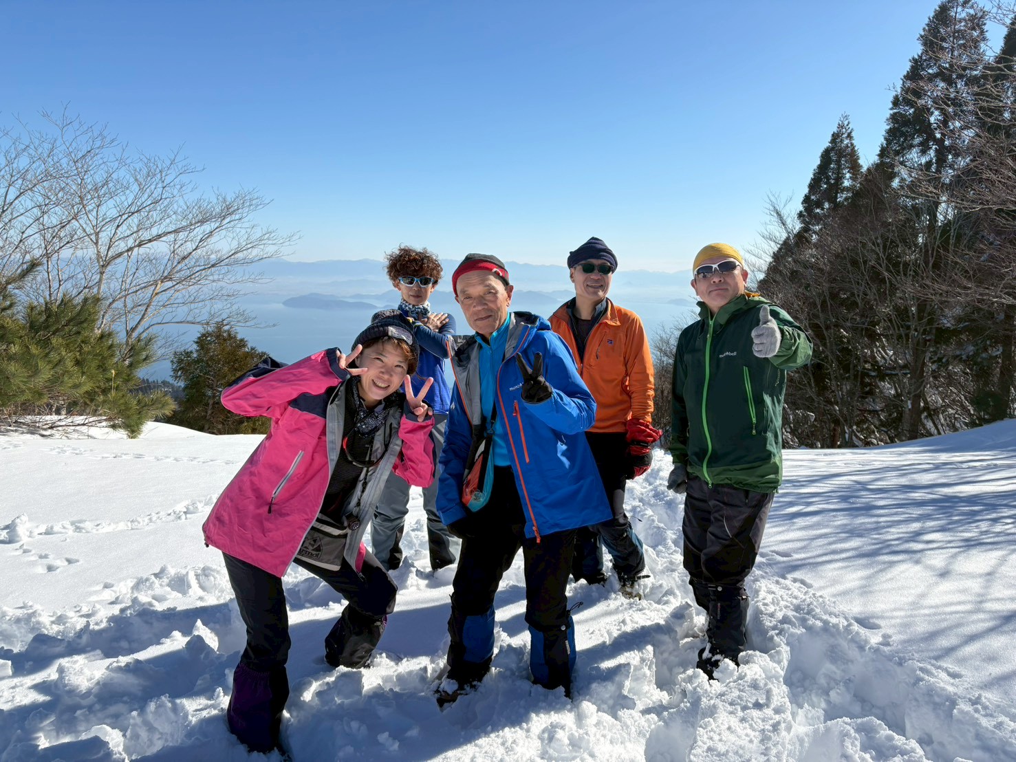 予想に反して武奈ヶ岳は晴天で、山から見える琵琶湖の景色は素敵ですね。せっかくの新雪なのでテント設営後は皆でわかん・プチラッセル体験をしました。