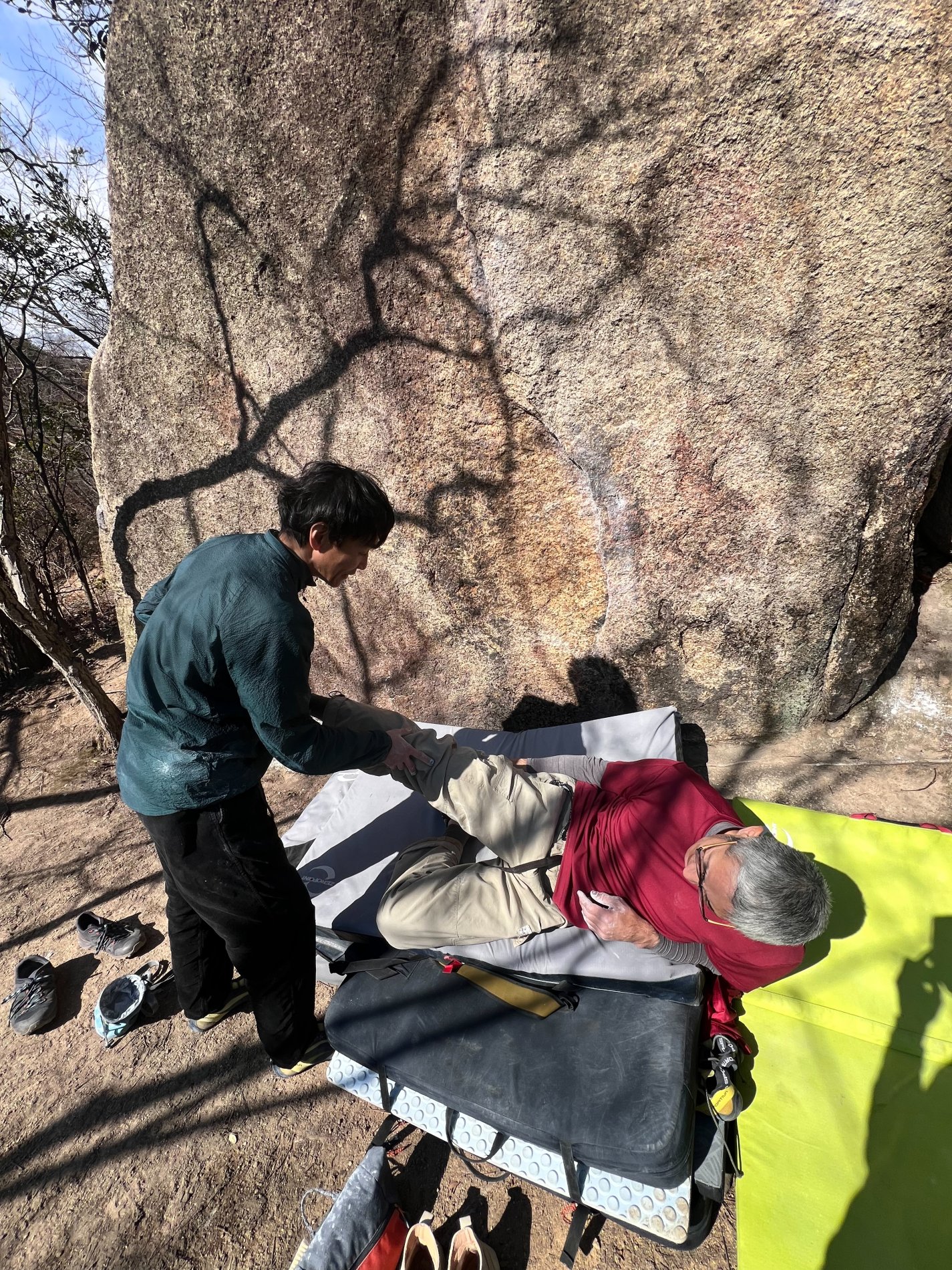 いい所見せようと鼻息荒く取りついたyukkiは、登り始めて2秒で足攣って落ちてくるしで散々